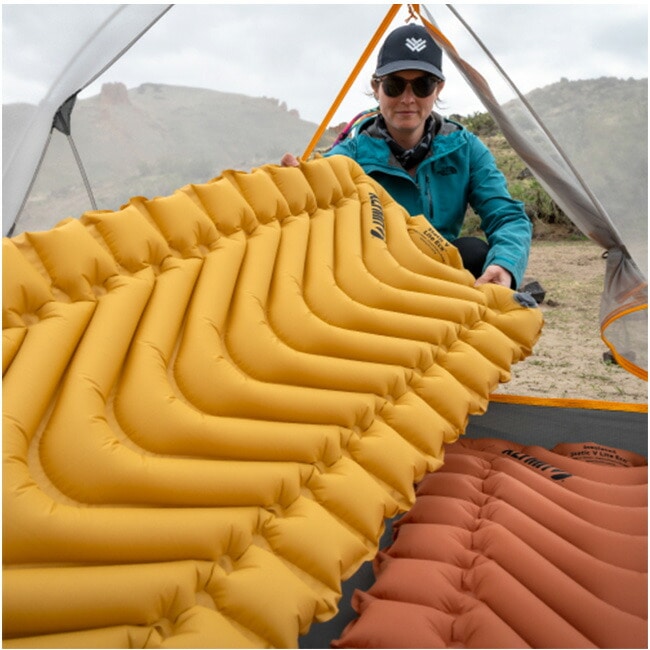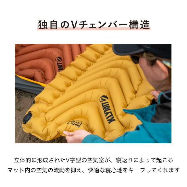 KLYMIT独自のVチェンバー構造により、寝返りで起こるマット内の空気の流動を最小限に抑え、どんなフィールドでも快適な寝心地を実現。