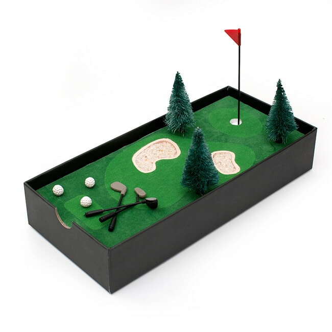 ミニゴルフクラブとボール3本、デコレーションツリー3本、そしてバンカーを埋めるためのクォーツサンドが入っています。