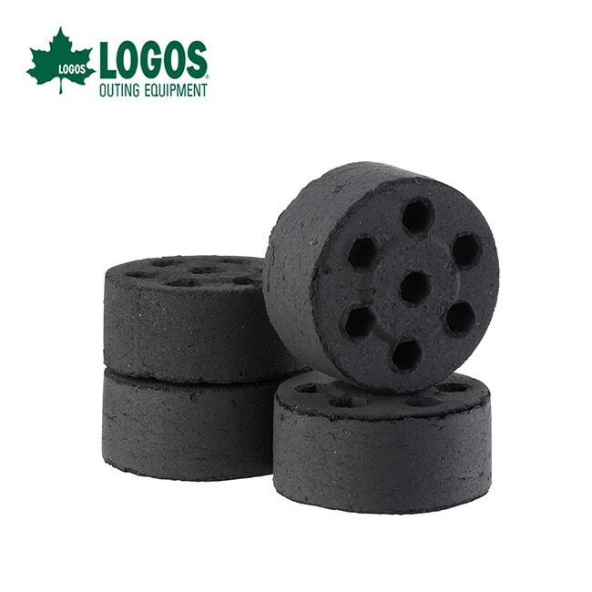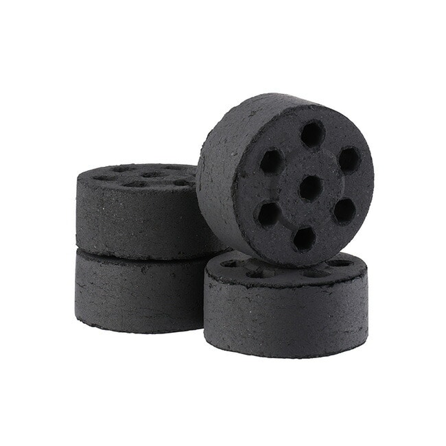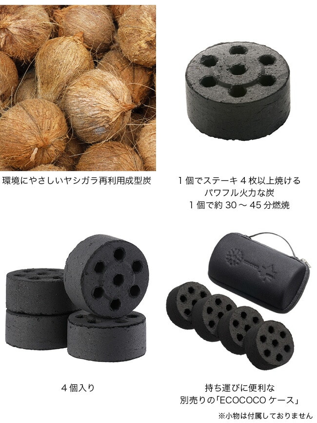 ヤシガラ廃材を再利用した、地球にやさしいヤシガラ成型炭。1個でステーキ4枚以上焼けるエコココロゴス・ミニラウンドストーブ4個入り。