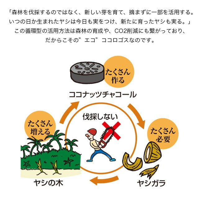 ・主原料はヤシガラ。需要により伐採するのではなく、需要と共に育てていく燃料