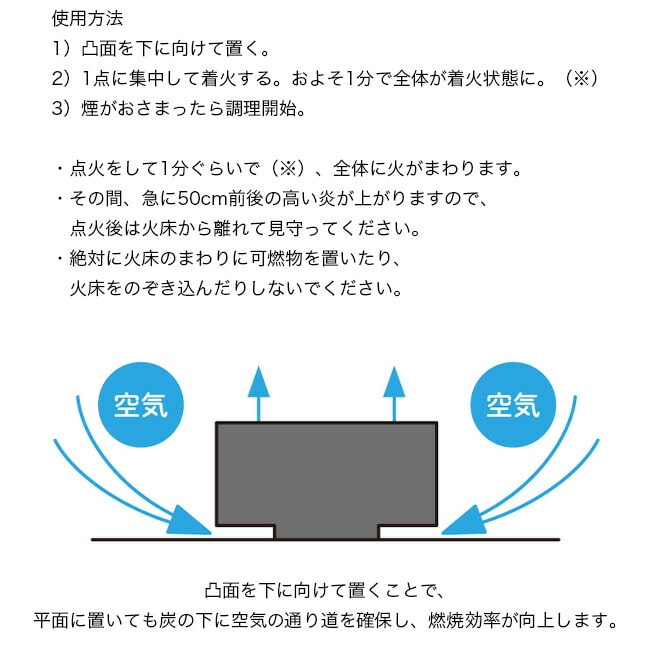 ・中央の凸を下向けに使用することで空気の通りを良くし、燃焼効率を高めます