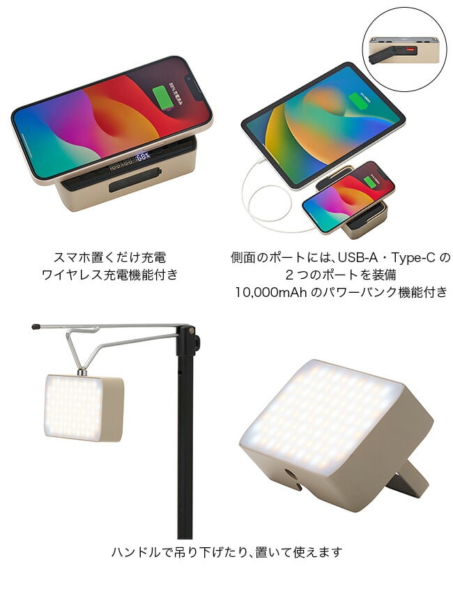 ・ワイヤレス充電・USB・Type-Cに対応する10000mAhパワーのランタン