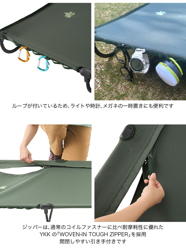 ジッパー開閉組み立て式を採用したローコットは、フレームと生地が一体式のため、手間なく簡単かつスピーディーに設営&撤収できます。ジッパーは、YKKの「WOVEN-IN TOUGH ZIPPER」を採用。