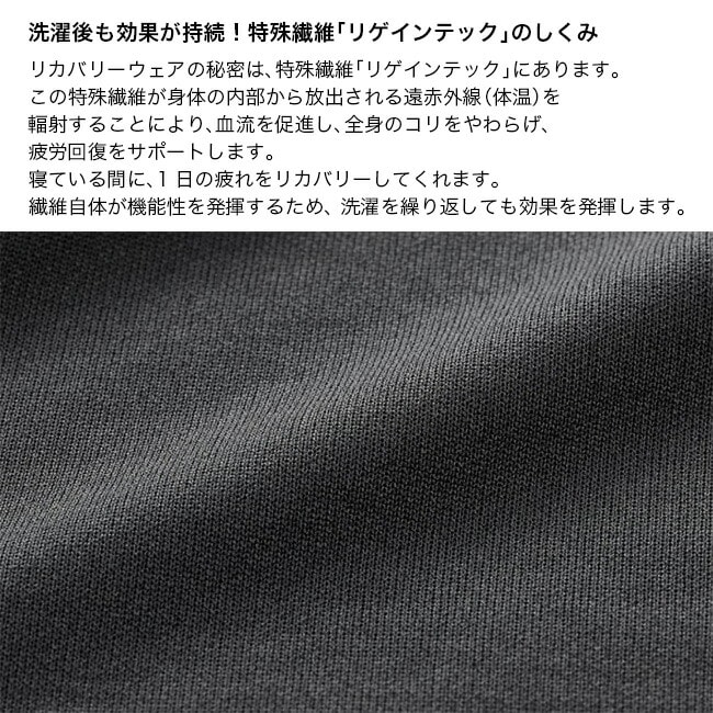 自らの体温による遠赤外線を輻射させる特殊繊維「リゲインテック」を使用した疲労回復ウェア。着るだけで血流を促進し、全身の筋肉のハリ・コリをほぐし、疲労回復をサポートします。