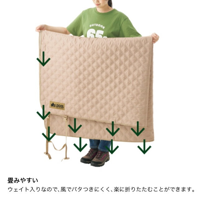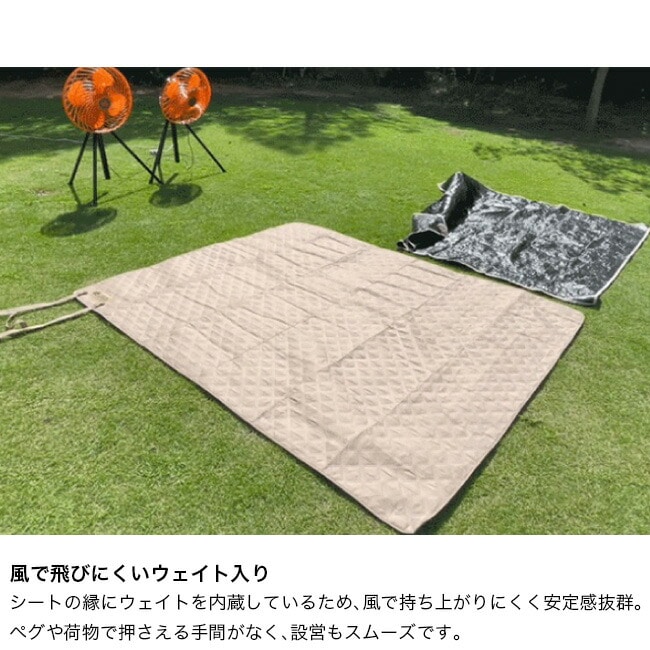 ウェイト入り構造で、風に強く、設置も撤収もスマートなレジャーシート。四隅に荷物を置く必要がなく、風でめくれにくいのが特長。