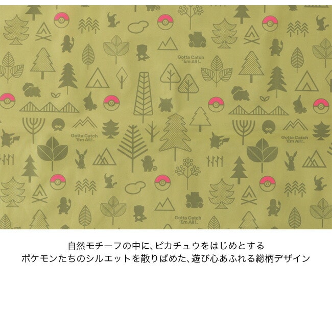 自然モチーフの中にポケモンたちのシルエットを散りばめたデザインで、日常からアウトドアまで楽しく使えるアイテムです。