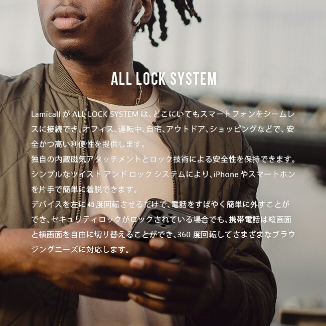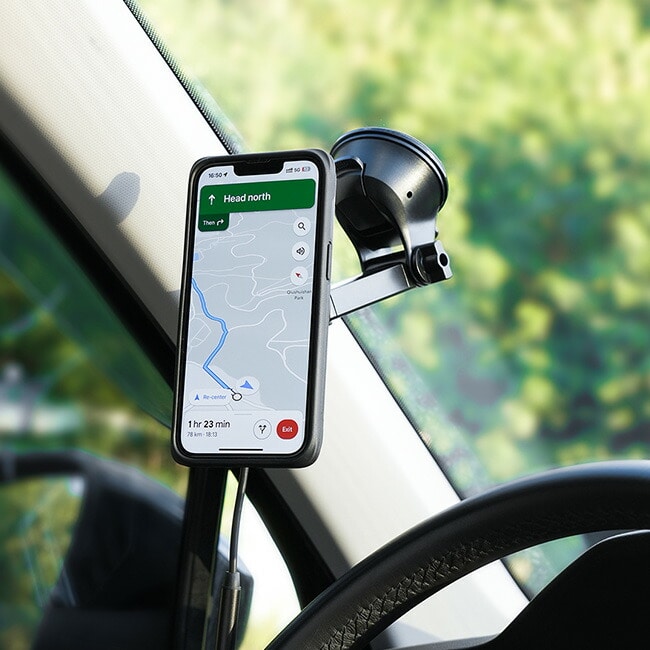 片手だけで素早くスマートフォンを装着し、スマートロック機構により、道路の凹凸を乗り越え、スマートフォンを安全にホールドします。