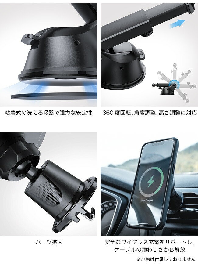 スマートフォンをフロントガラス、ダッシュボード、吹き出し口に取り付けることができ、より簡単かつ安全に操作方法を提供します。