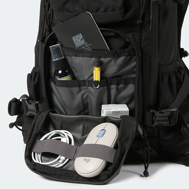 本やタブレットを入れるドキュメントスリーブ、両サイドには縦型のポケットを配置し、ウォータボトル、折り畳み傘、小ぶりな三脚などをスマートに収納することができます。