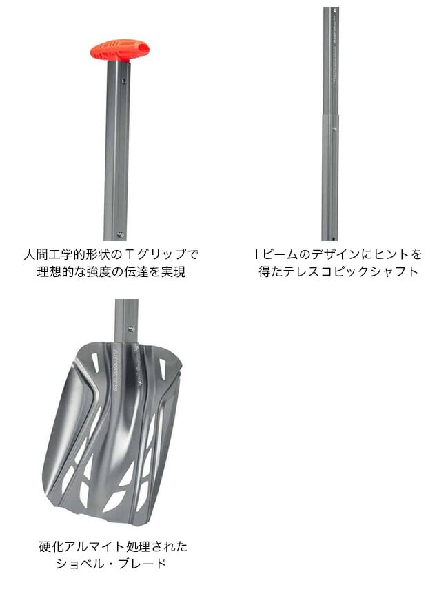 マムートのアバランチシャベル全製品の例にもれず、この装備に不可欠なアイテムも雪崩時のデブりをかき分けるのに特化したデザインとなっています。
