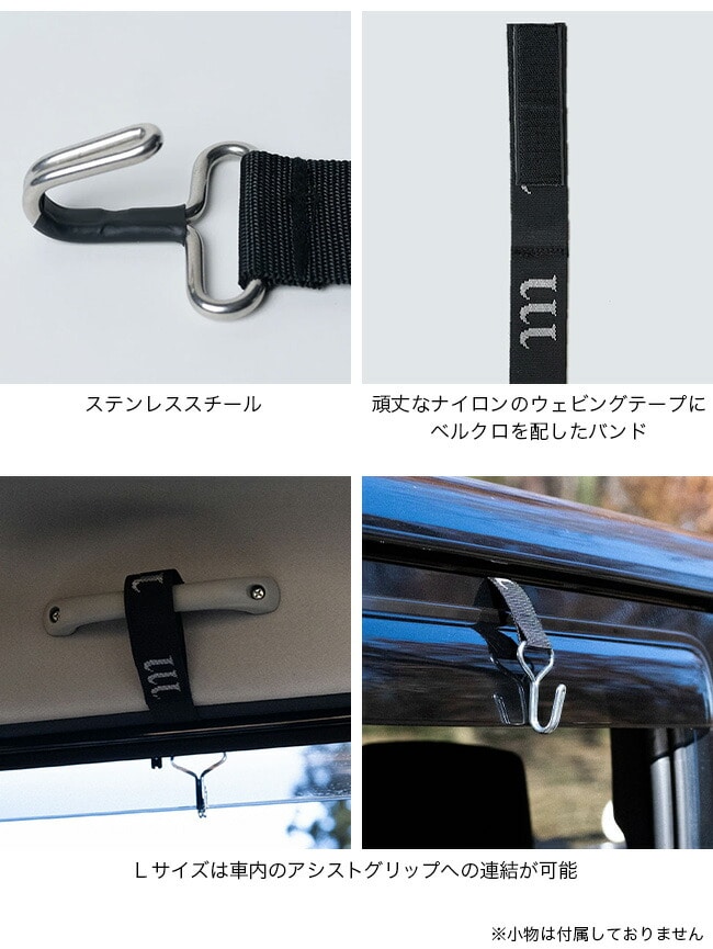 頑丈なナイロンのウェビングテープにベルクロを配し、様々な物を吊り下げることのできる商品です。