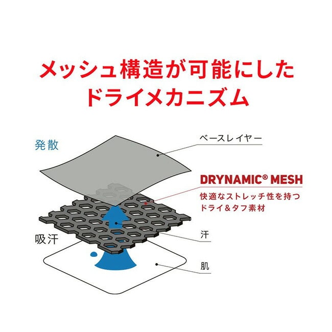 疎水性に優れ、熱伝導率の低いポリプロピレンをベースに、かさ高メッシュで編み上げることで肌面の汗を素早く吸収し、上位のベースレイヤーに拡散します。さらに汗を吸ったベースレイヤーはメッシュの厚みによって肌から遠ざけられ、肌面の冷えを防ぎ、ドライ感を保ちます。