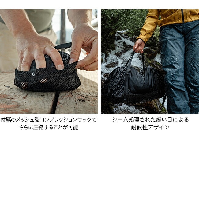 収納時にはメッシュのフロントポケットに入れるか、付属のメッシュコンプレッションサックを使ってさらに圧縮することができます。