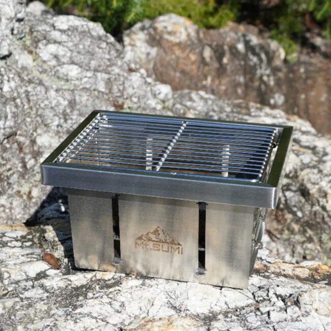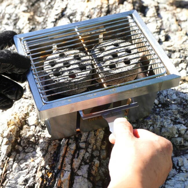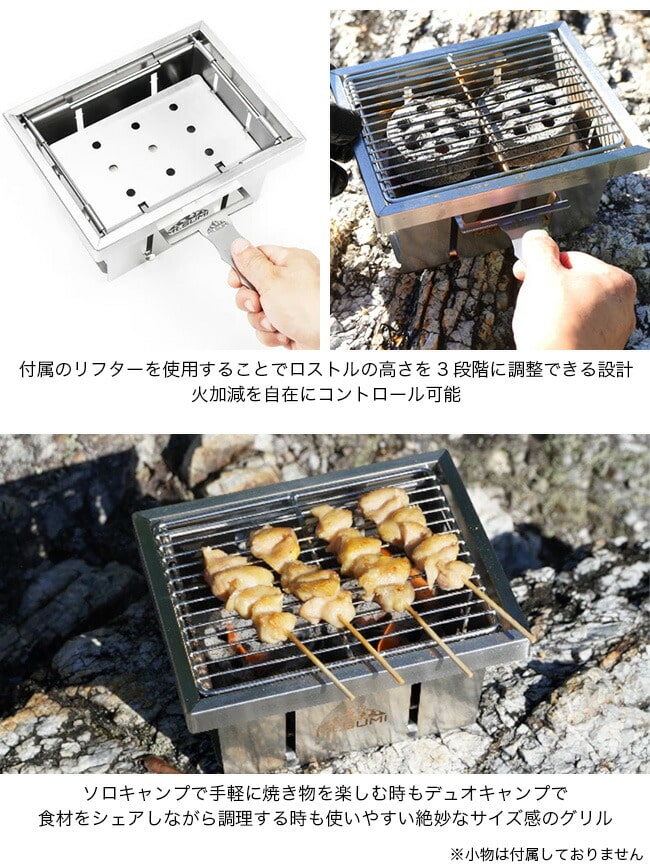 グリルとしての使用はもちろん、スキレットやダッチオーブンにも対応する堅牢な設計。ソロキャンプで手軽に焼き物を楽しむ時も、デュオキャンプで食材をシェアしながら調理する時も使いやすい、絶妙なサイズ感のグリルです。