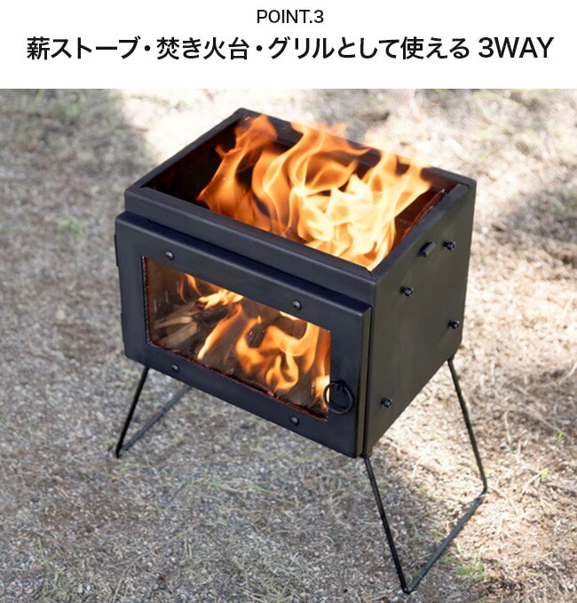 薪ストーブとして天板での調理はもちろん、天板を外すと二次燃焼構造の焚き火台としても使用でき、付属の焼き網を使えばグリル調理も楽しめる3WAYタイプ(※燃料に炭は使用できません)。