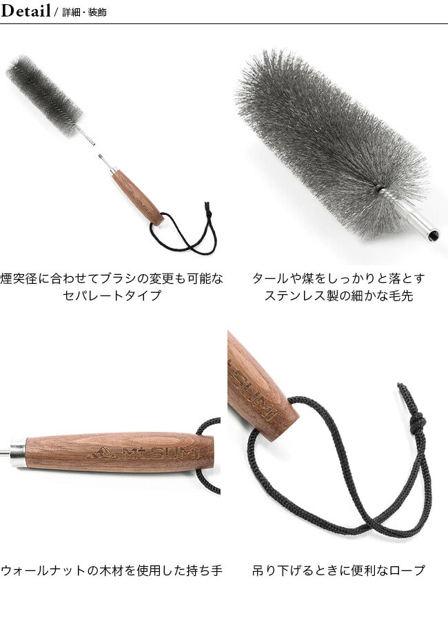 サイズはMt.SUMIの薪ストーブ煙突の径に合わせた直径58mmと直径80mmの2サイズで、共に持ち手は統一なので煙突径に合わせてブラシの変更も可能。