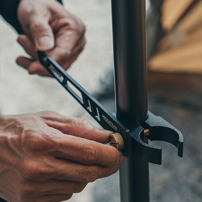 丈夫で軽量なアルミニウム合金製に加え、好みの高さに取り付けができ便利な角度調整機能付き。