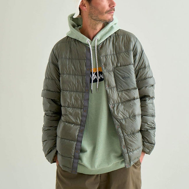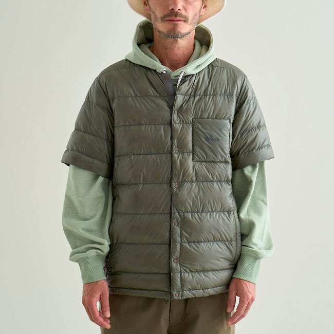 キャンプ時も、暖かい昼間には長袖シャツやロンTEEの上にダウンTEEとして着用いただき、寒くなったら袖を取り付けるなどマルチに活躍します。