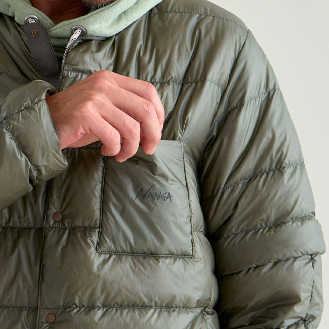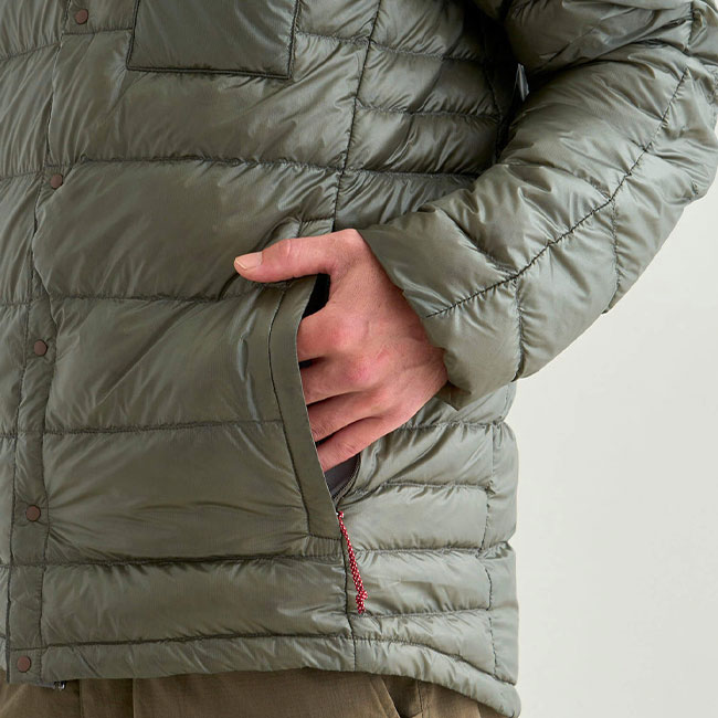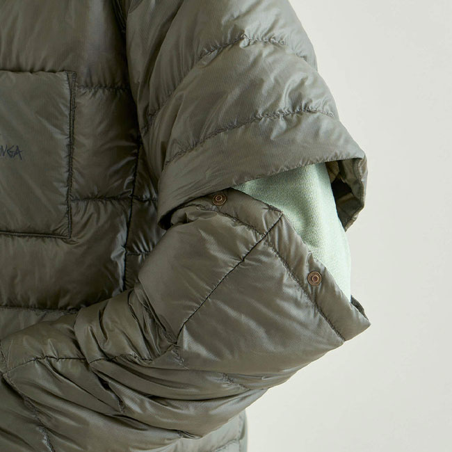表裏生地には10dnリサイクルナイロン、羽毛には650FPのリサイクルダウンを使用したエコフレンドリーモデル。