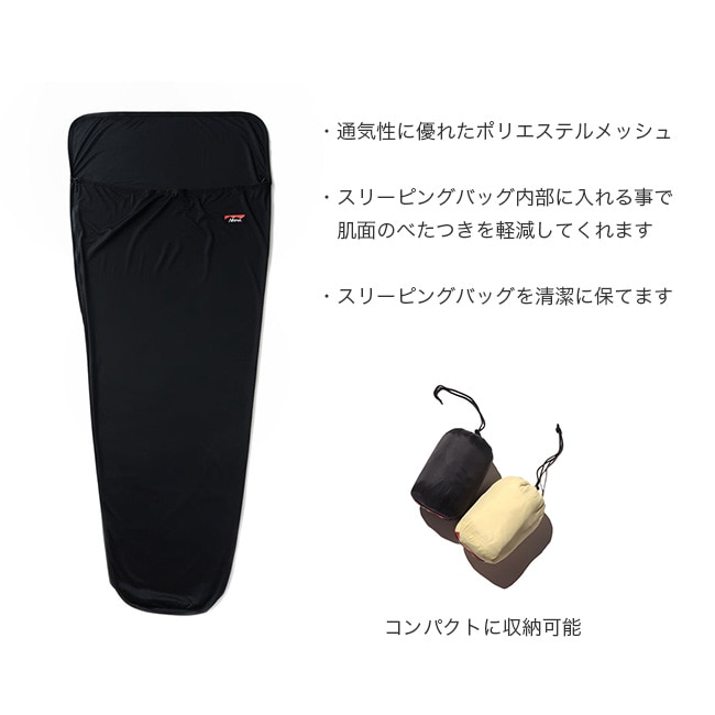 通気性に優れたポリエステルメッシュを使用したインナーシーツ。スリーピングバッグ内部に入れる事で肌面のベタ付きを軽減し、快適な寝心地にしてくれます。