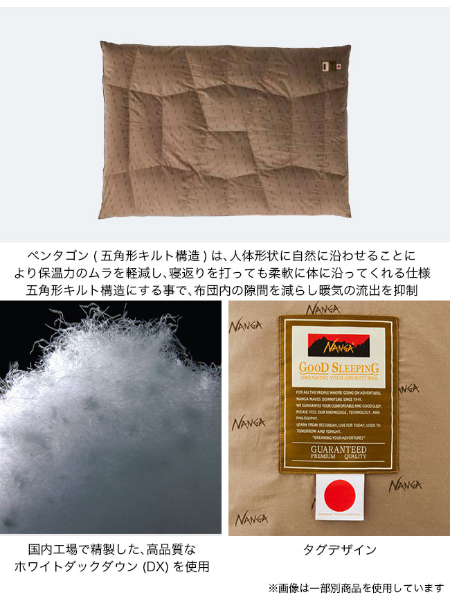 アウトドアという過酷な環境下で培ったスリーピングバッグ(寝袋)のノウハウ を活かした羽毛布団。ペンタゴン(五角形キルト構造)は、人体形状に自然に沿わせることにより保温力のムラを軽減し、寝返りを打っても柔軟に体に沿ってくれます。