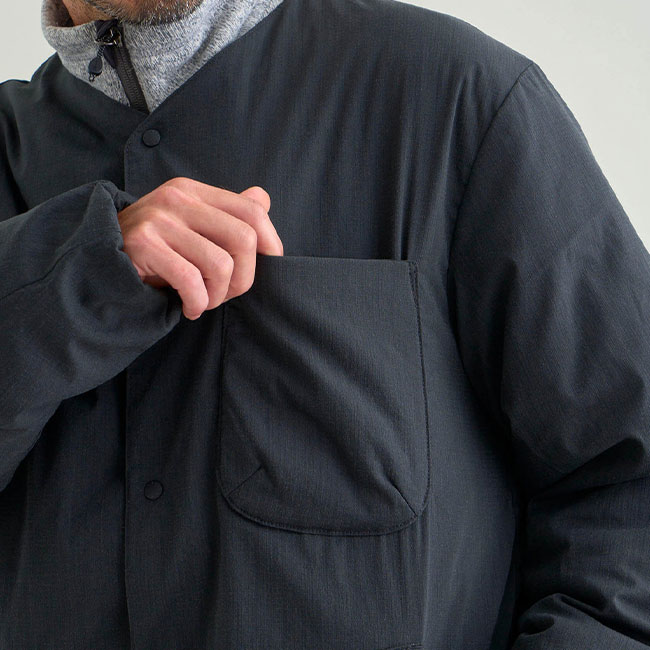 10~11月ごろまではアウターとして、12月以降~はシェル、マウンテンパーカーや、オーバーコートのインナーとしても着用いただけますので、長い期間ご着用いただける万能アイテム。