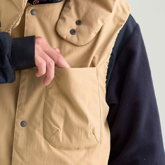 胸ポケットが1つ、腰ポケットが2つのシンプルなデザインで、インナーとして着用する場合は、どんなアウターとも合わせやすくなっています。