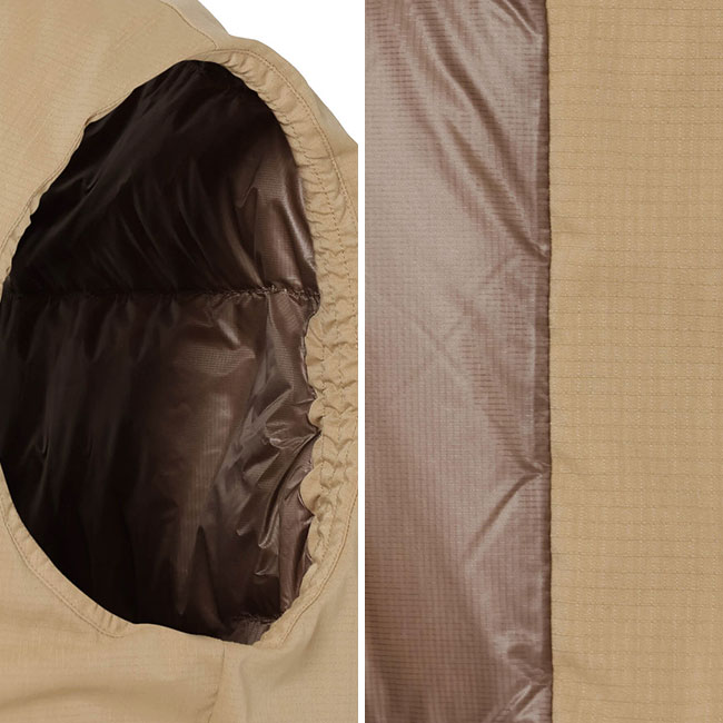 雨天時など外側からの水気や、フィールドでの作業時の汗等、内側からの湿気によりダウンが濡れて小さくなり、保温力が低下するのを最小限に抑えます。
