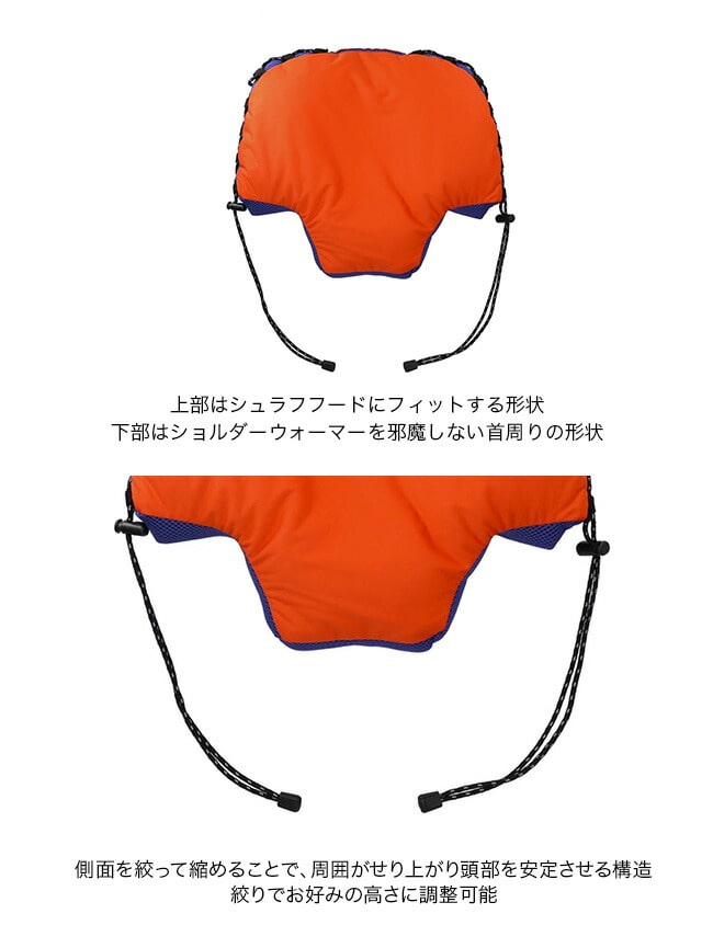 寝袋の機能をを損なわないよう、フードや肩のカーブに沿う形で設計した寝袋専用の枕になります。側面のドローコードを絞ることで高さ調節も可能。