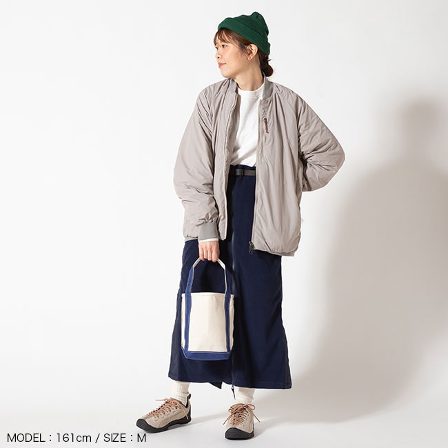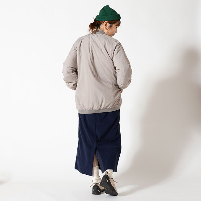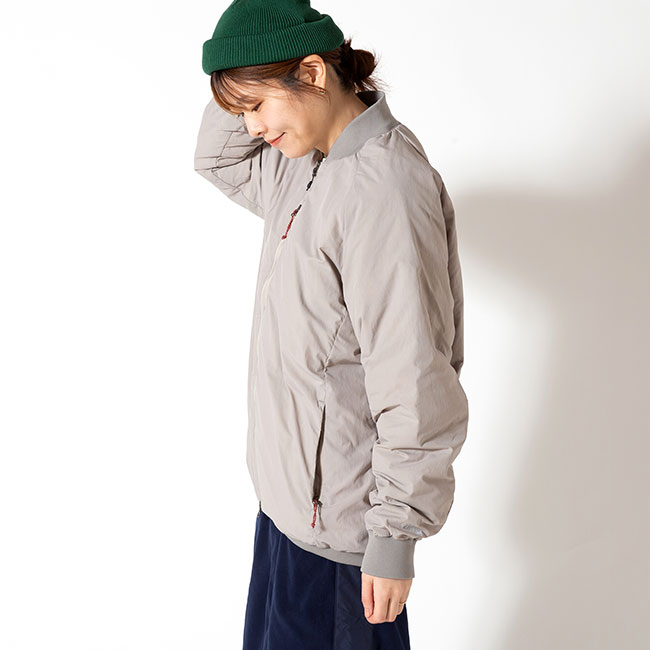 スポーティーなデザインのバーシティジャケット(スタジャン)をベースにしたブルゾン。春や秋のアウターとして活躍するこの一着は、羽毛量を調整し、冬のダウンジャケットに比べて軽量で快適な着心地を提供します。