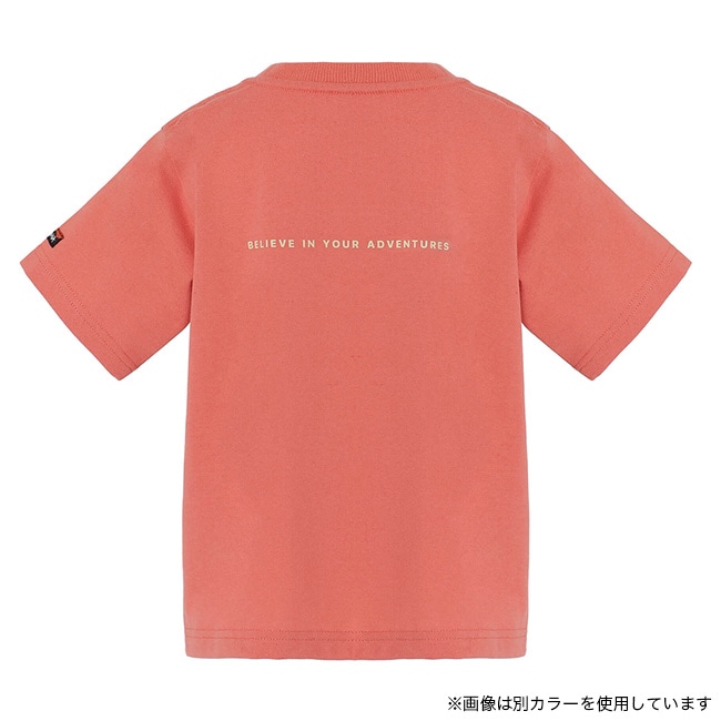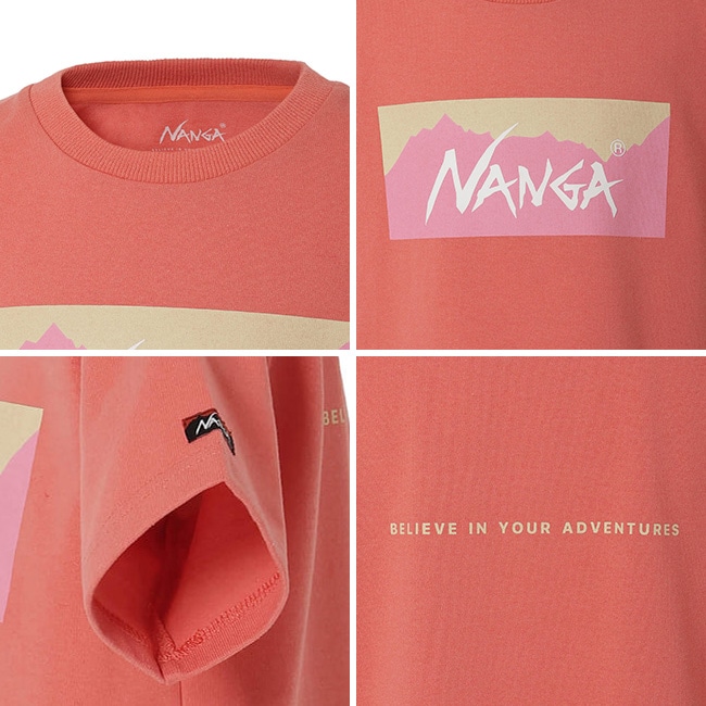 ナンガの定番アイテム「BOX LOGO TEE」のキッズサイズモデル。フロントには存在感のあるボックスロゴ、バックには“BELIEVE IN YOUR ADVENTURES”のスローガンをプリント。