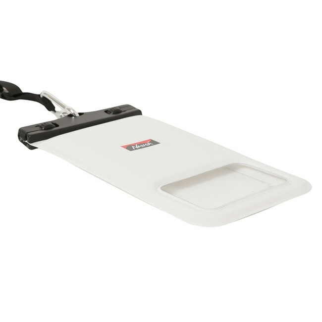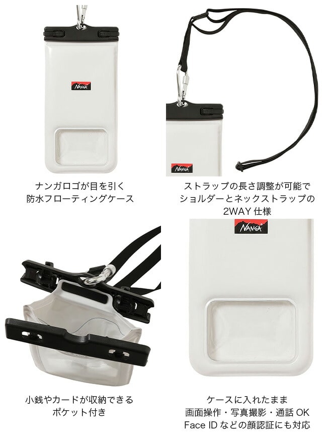 ナンガロゴが目を引く防水フローティングケース。防水性と防塵性(固形物の製品内部への侵入を防止すること)が高く、海や川、プールなどで安心してスマートフォンを携帯できます。