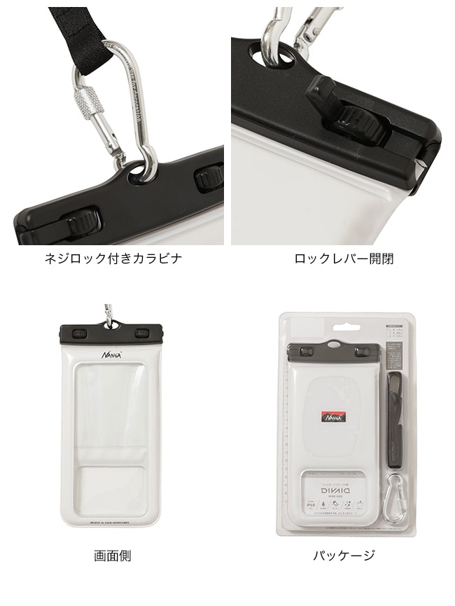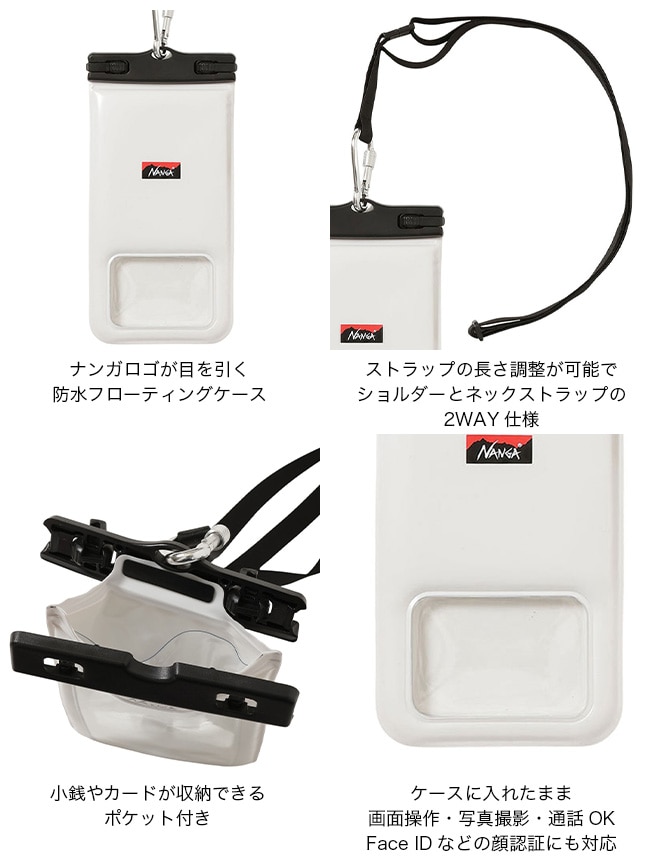 ナンガのロゴが印象的な防水フローティングケースは、機能性とデザインを兼ね備えたアイテムです。ストラップは長さ調整が可能で、ショルダーとネックストラップの2WAY仕様になっており、使い方に応じて自由に調整できます。