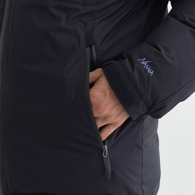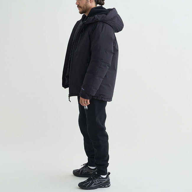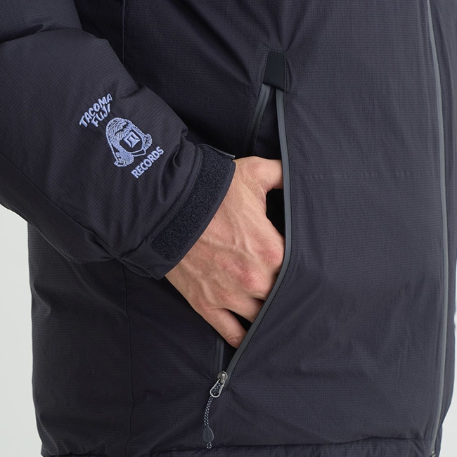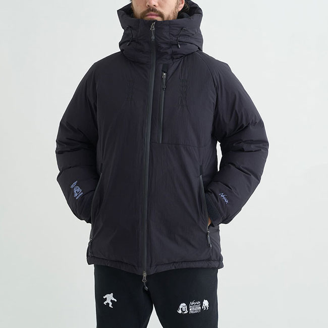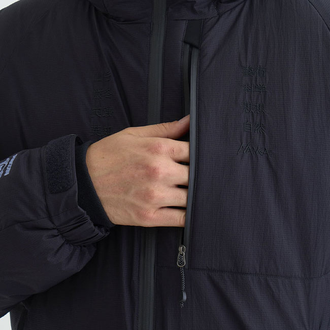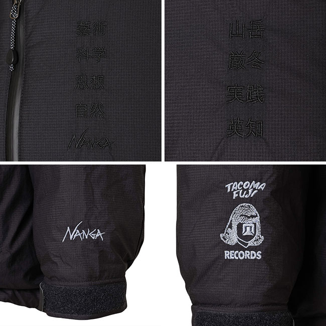 AURORA TEX DOWN JACKET(MEN)をベースにタコマフジ流にアレンジしたダウンジャケット。タコマフジのTシャツでもお馴染み、森羅万象を意味する「藝術科学思想自然」を左胸に、右胸にはNANGAの30周年に渡る足跡を讃える「山岳厳冬実践英知」をボディ同色の刺繍。