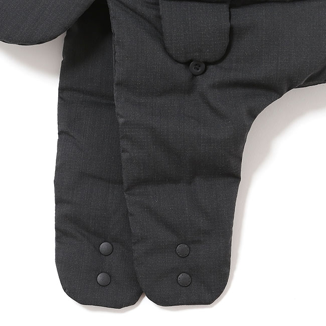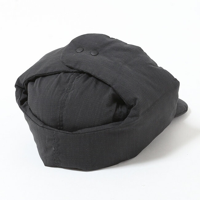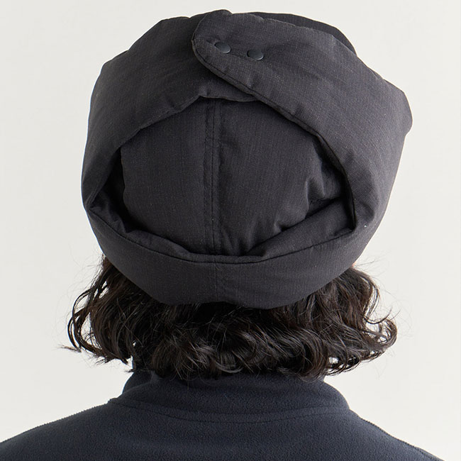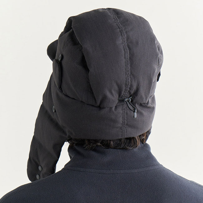 固さを軽減した難燃リップストップ生地を使用したイヤーフラップキャップ。Re:CYCLE DOWN(650FP)のダウンを使用してボリューム感と共に防寒ができるデザインと実用性を兼ね備えたヒノックリップストップダウンイヤーフラップキャップ。