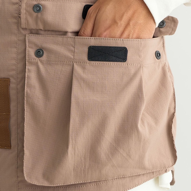 フロントには三角カン付きの胸ポケットや、大型のマチ付きフラップポケットを配し、ギアやツール類を整理しやすい構造に。