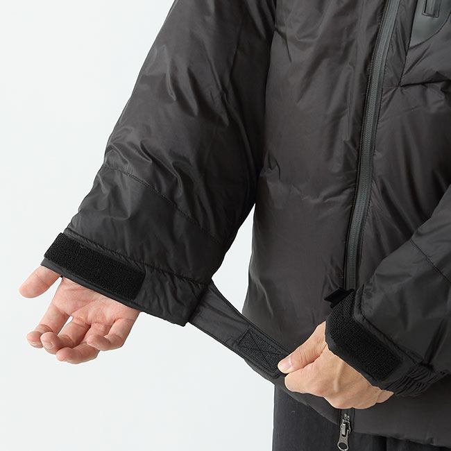 また、袖口のベルクロ、裾のドローコードでも温度調整や防水防風性能を向上させることができます。