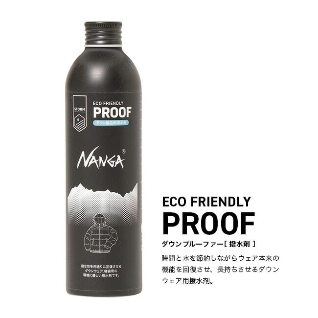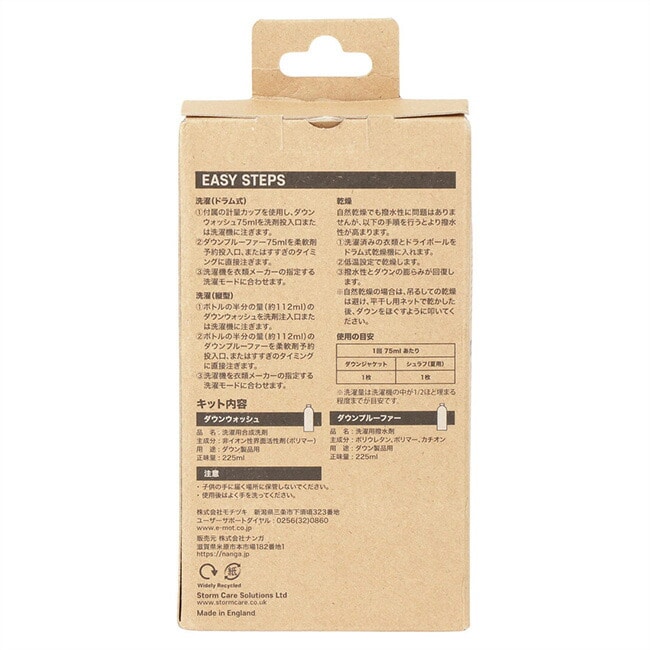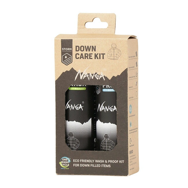 ダウン製品全般の洗濯、クリーニングに使える洗剤と撥水剤が、NANGA特注パッケージに。撥水剤と一度に入れて洗濯できるの大きな特徴。