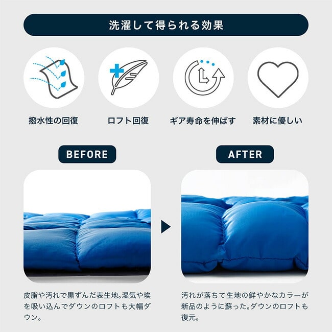 汗や皮脂、ホコリなどでダウンや生地が汚れてしまうと、ダウンがスムーズに呼吸することができなくなり、ロフト低下=保温性の低下を招きます。