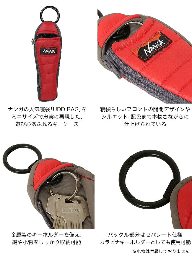 ナンガの人気寝袋「UDD BAG」をミニサイズで忠実に再現した、遊び心あふれるキーケース。寝袋らしいフロントの開閉デザインやシルエット、配色まで本物さながらに仕上げられており、思わず二度見されるユニークなアイテムです。