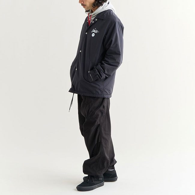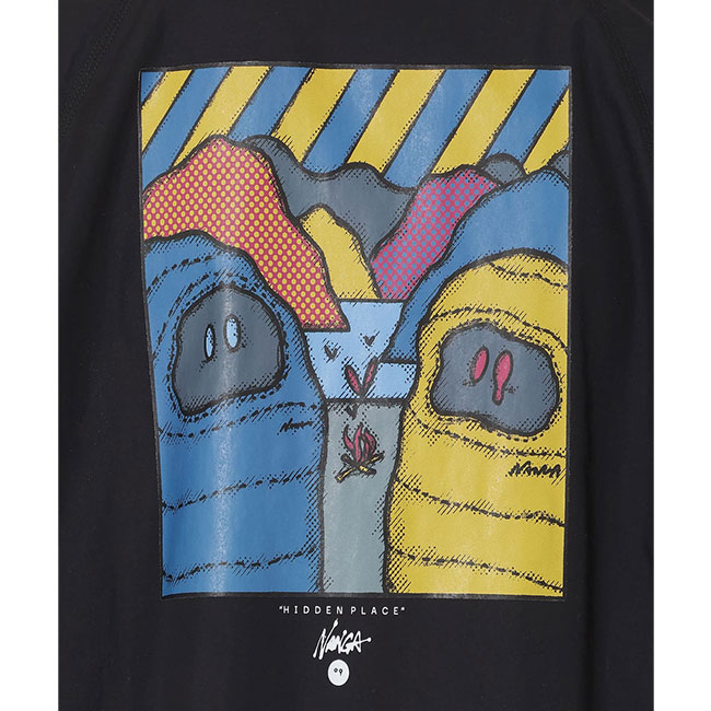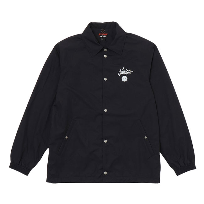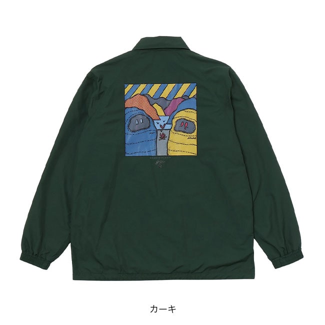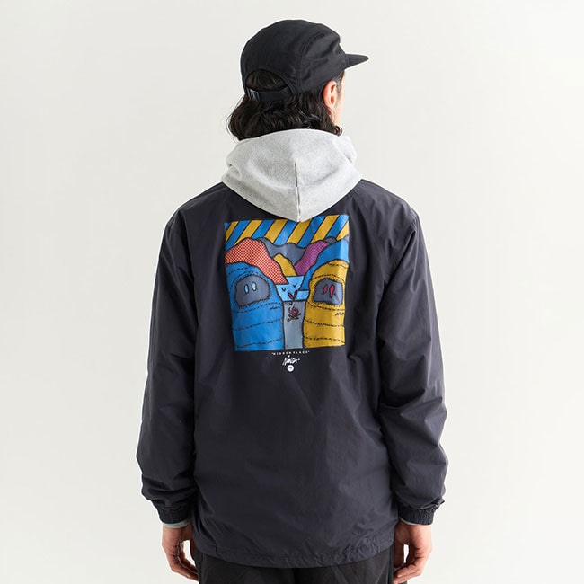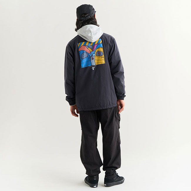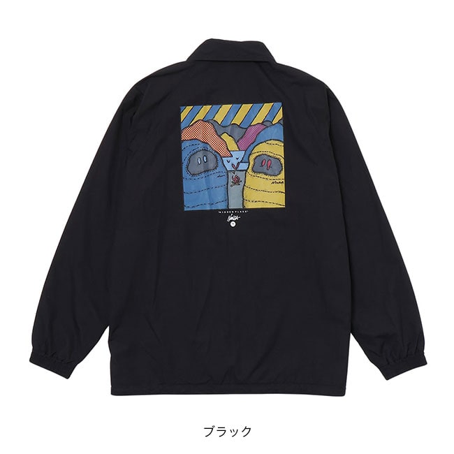 裏地にトリコットを貼り合わせた保温性の高いWARM COACH JACKETをベースに、背面にはアーティスト・神山隆二氏による描き下ろしグラフィックを大胆にプリントしました。キャラクターの背後には焚き火や湖、そして山々がカラフルに描かれ、自然の風景と遊び心が融合した印象的なデザインに仕上がっています。