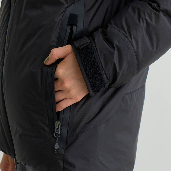 また、袖口のベルクロ、裾のドローコードでも温度調整や防水防風性能を向上させることができます。