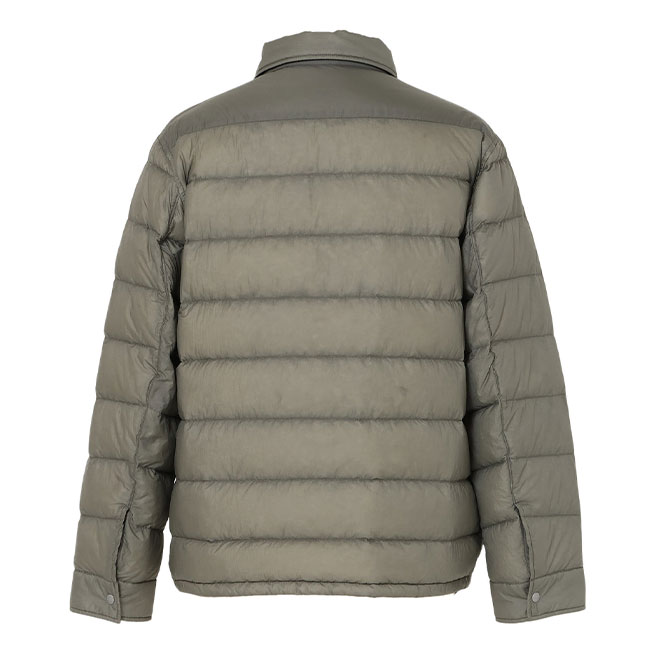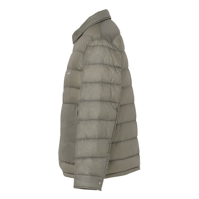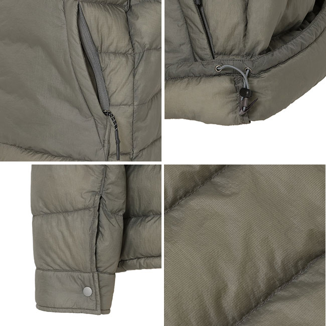 軽量素材の透け感を生かし、羽毛の表情をデザインとして取り込んだシャツ型ダウンブルゾン。素材と羽毛が重なり合うことで生まれる柔らかな陰影が、SHEER DOWN SERIESならではの上品で軽快なムードを演出します。