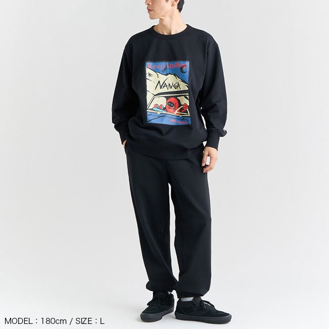 寝袋マンが車でドライブしている様子をクラシックポスター風に描いたオリジナルグラフィックをフロントにプリントしたスウェットシャツ。“Live a comfortable life that suits you!(自分らしい心地よい生き方を!)” をテーマに、旅やアウトドアを楽しむ軽やかなムードを表現。