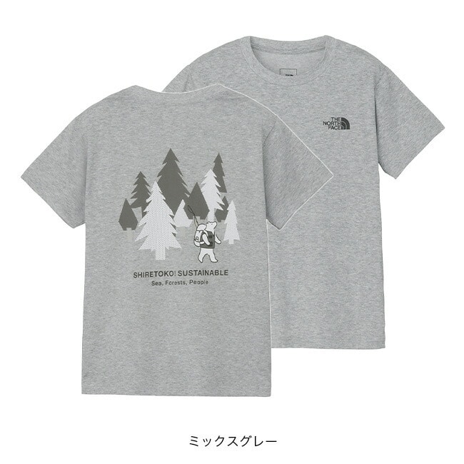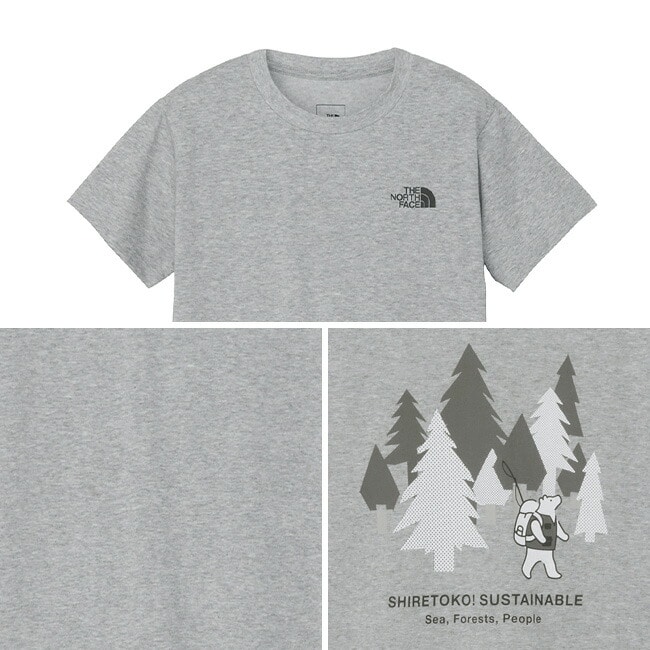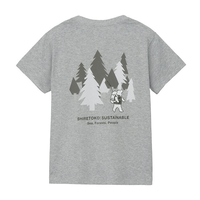 背面には、釣竿を携え大きなバックパックを背負ったトコさんが知床の森を歩く姿を描いた、物語性のあるグラフィックを大胆に配置しました。生地には、リサイクルポリエステルとオーガニックコットンを混紡した速乾性ニット素材を採用。
