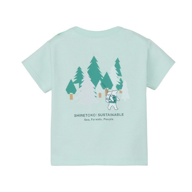 背面には、釣竿を手に大きなバックパックを背負い、知床の森を歩くトコさんの愛らしいグラフィックを配置し、物語性のあるデザインに仕上げました。生地には、リサイクルポリエステルとオーガニックコットンを混紡した速乾性ニット素材を使用。