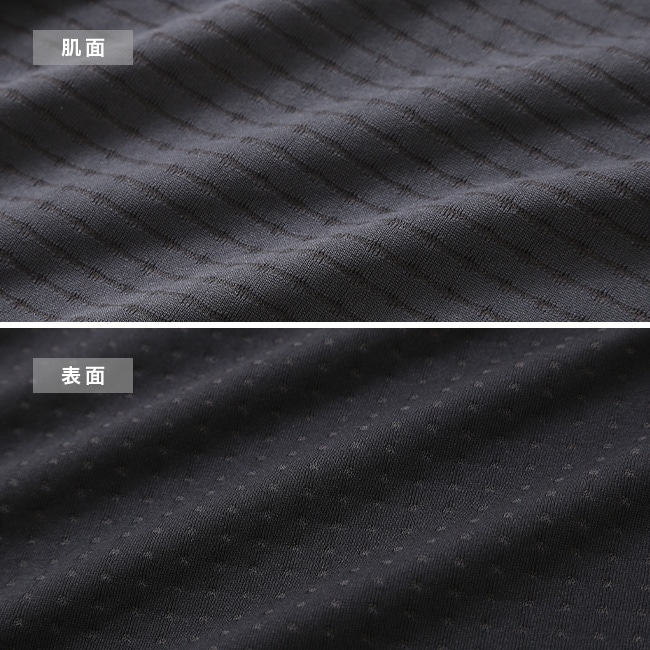 生地は、肌面にはっ水加工を施したドライ層を用い、表面は汗を素早く拡散し乾燥させる吸水層で構成したダブルフェイス構造。汗をかいても肌面のドライ層からドット上の接結面を通じて、スムーズに生地表面に吸水し移行させて乾燥を促します。