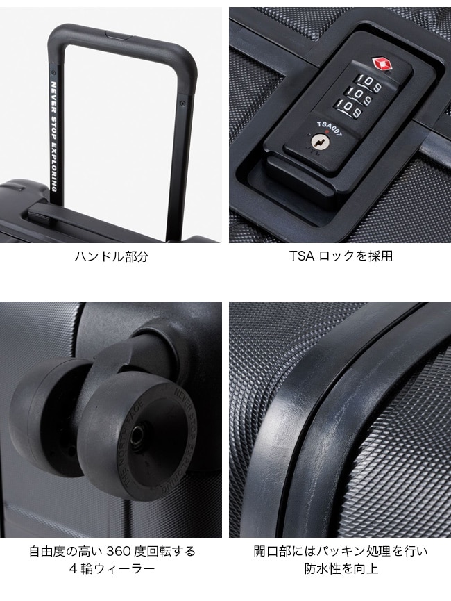 ロック構造には、米国運輸保安局より認可を受けた先進のロックシステム、TSA LOCK(アメリカ合衆国国土安全保障省の運輸保安庁から認定を受けた施錠機構の総称)を採用しています。