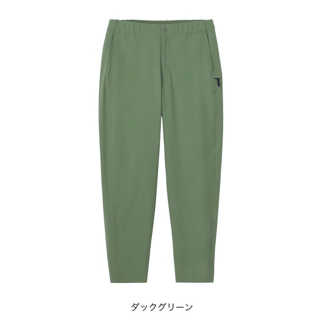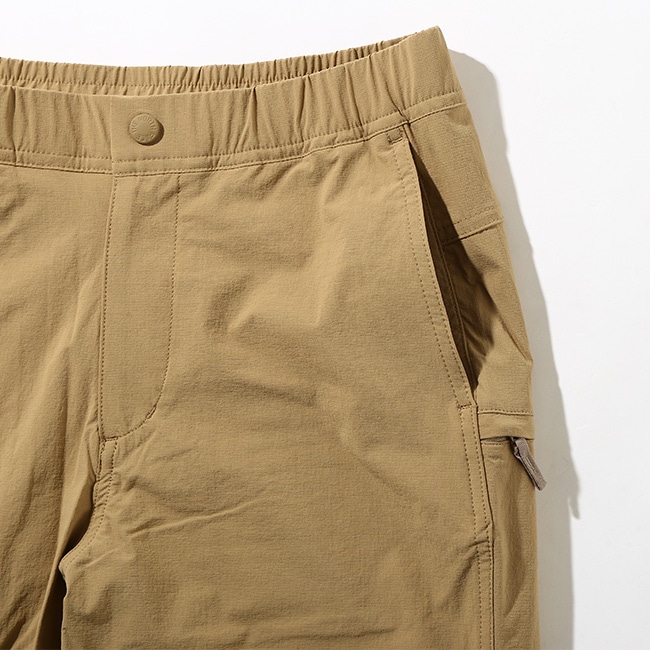 一部リサイクルナイロンを使用したリップストップ生地はストレッチ性と適度なハリ感があり、はっ水加工を施しているため多少の雨は弾きます。脚さばきが快適なテーパードシルエットで、左サイドには地図が入るサイズの縦長のポケットを配置。