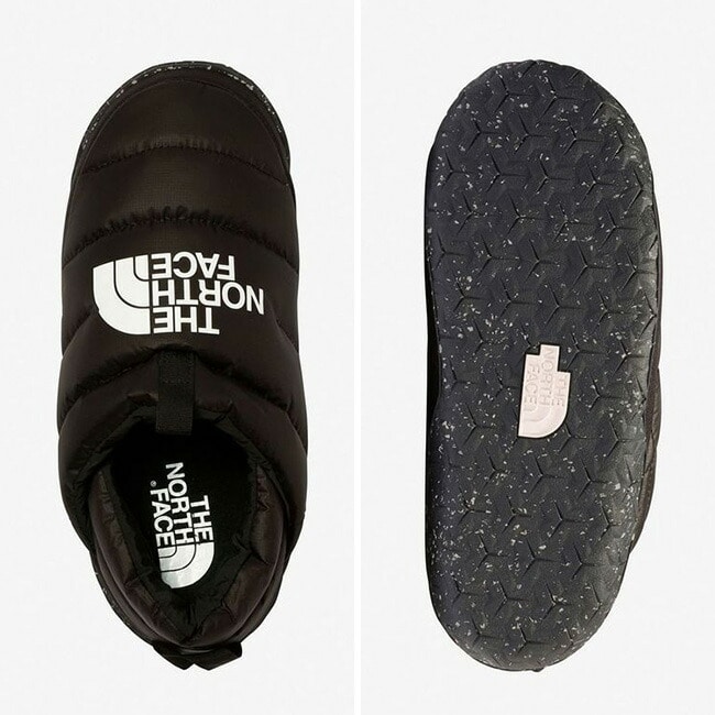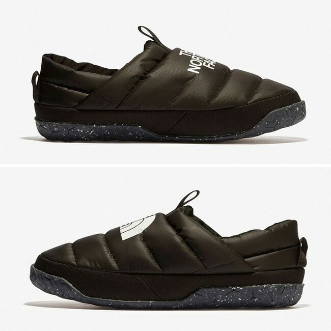 はっ水加工を施したリサイクルポリエステルをアッパーに使用し、550フィルパワーのダウンを封入。フットベッドのライニングは素足でも心地よく履けるフリース仕様。